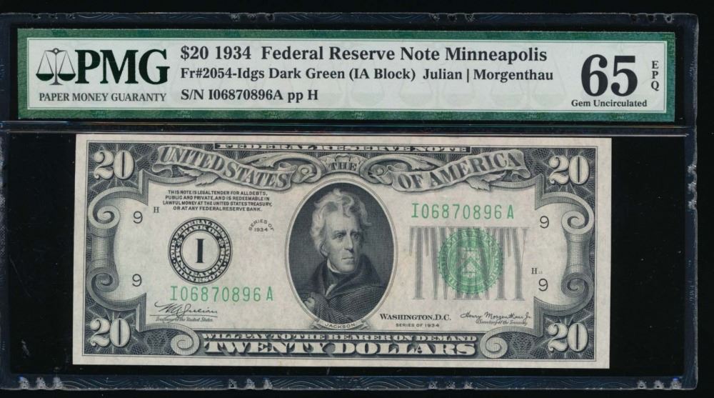 One 1934 $20 Minneapolis Federal Reserve Note PMG 65EPQ.