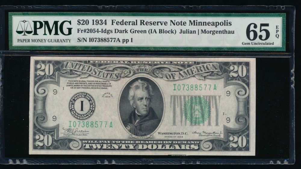 One 1934 $20 Minneapolis Federal Reserve Note PMG 65EPQ.