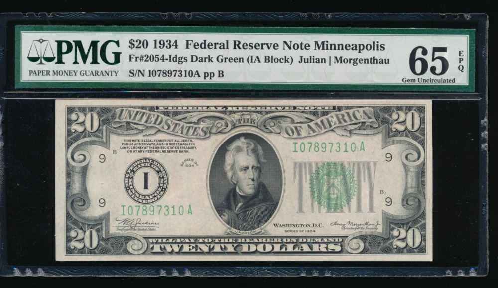 One 1934 $20 Minneapolis Federal Reserve Note PMG 65EPQ.