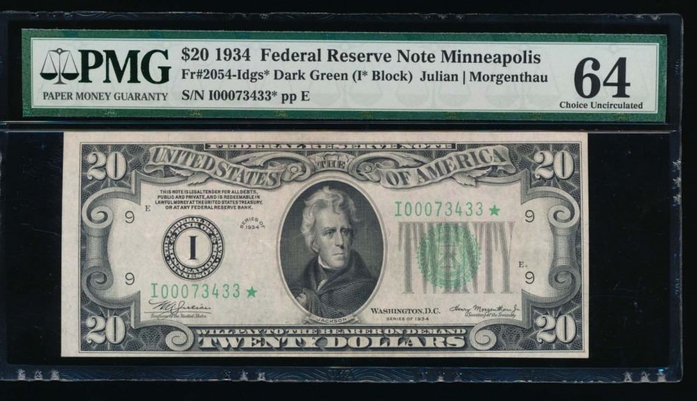 One 1934 $20 Minneapolis Federal Reserve Star Note PMG 64.