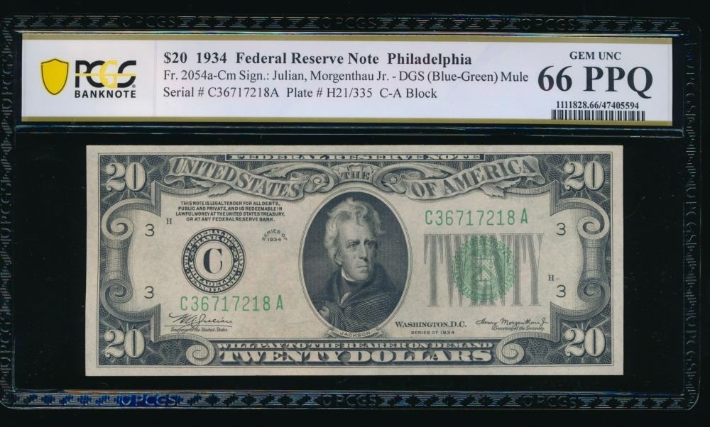 One 1934 $20 Philadelphia FRN PCGS 66PPQ.