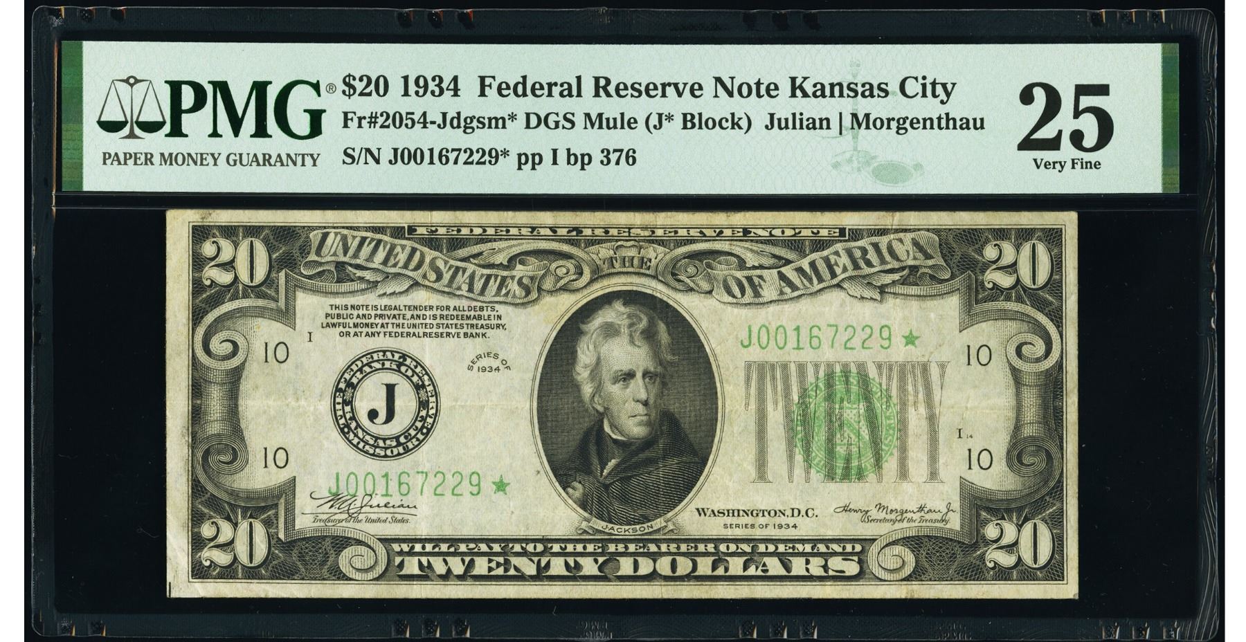 One 1934 $20 STAR Mule Kansas City FRN PMG 25.