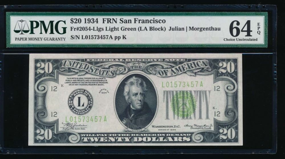 One 1934 $20 San Francisco Federal Reserve Note PMG 64EPQ.