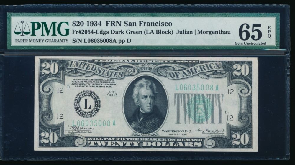 One 1934 $20 San Francisco Federal Reserve Note PMG 65EPQ.