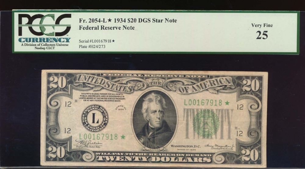 One 1934 $20 San Francisco Federal Reserve Star Note PCGS 25.
