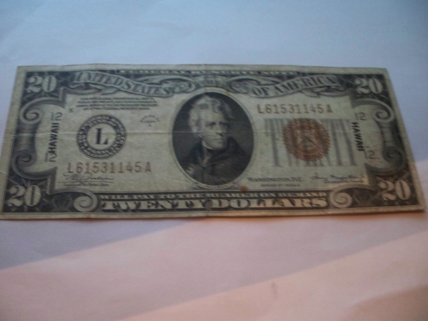 1934 $20 WWII Hawaii Note, Brown Seal, Emergency Issue