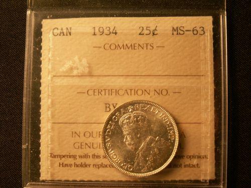 1934 25¢ ICCS MS63. White and brilliant. A scarce date.