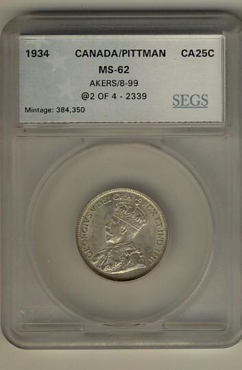 1934 25¢ SEGS MS62. Pittman example