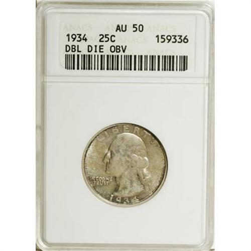 <B>1934 25C Doubled Die Obverse AU50 ANACS.</B></I> NGC Census: (0/0). PCGS Population (10/96). Mintage: 31,912,052. (#5795)<BR><BR><B>Coin Engraver:</B> John Flanagan<BR><BR><b>Shipping:</b> Coins & Currency (<a target="_blank" href="http://www.heritageauctions.com/common/shipping.php">view shipping information</a>)