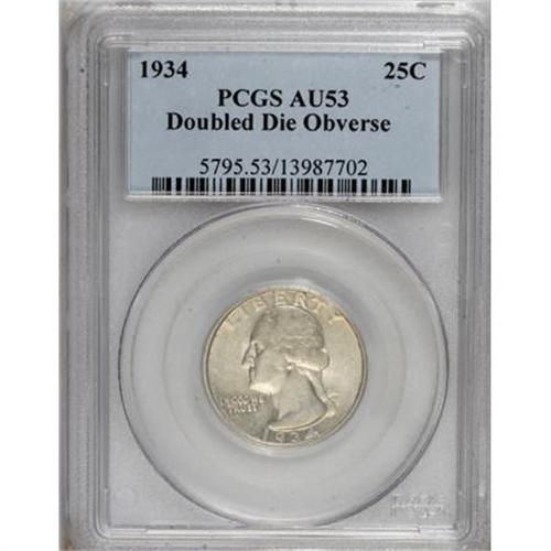 <B>1934 25C Doubled Die Obverse AU53 PCGS.</B></I> PCGS Population (5/92). NGC Census: (0/0). Mintage: 31,912,052. (#5795)<BR><BR><B>Coin Engraver:</B> John Flanagan<BR><BR><b>Shipping:</b> Coins & Currency (<a target="_blank" href="http://www.heritageauctions.com/common/shipping.php">view shipping information</a>)