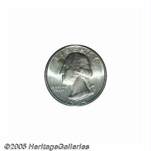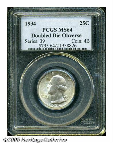 <B>1934<25C> Doubled Die Obverse MS64 PCGS.</B></I> FS-009. IN GOD WE TRUST is strongly die doubled; the date and LIBERTY have very thick letters. A lustrous and beautiful near-Gem, well preserved and lightly toned aside from a wisp of medium brown color near the forehead. Very scarce in finer grades, and a sleeper within the series in comparison with the relatively plentiful 1932-D and 1932-S keys. A complete collection of 1934 Quarters includes four pieces: the Light, Medium, and Heavy Mottos, and this important mint error. Population: 19 in 64, 24 finer (6/05).
