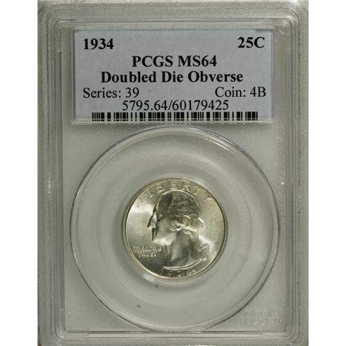 <B>1934 25C Doubled Die Obverse MS64 PCGS.</B></I> FS-009. Pronounced doubling is noted on IN GOD WE TRUST; separation is also visible on BER of LIBERTY, especially the E. Strongly lustrous surfaces display whispers of light tan-gold color, particularly around the borders, and exhibit well impressed design features. A few barely noticeable ticks on Washington's portrait and on the eagle preclude a higher grade. All in all, a very pleasing example of this popular variety.<BR><BR><b>Shipping:</b> Coins & Currency (<a target="_blank" href="http://www.heritageauctions.com/common/shipping.php">view shipping information</a>)