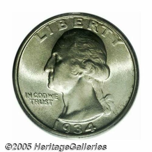 <B>1934<25C> Doubled Die Obverse MS64 PCGS.</B></I> FS-009. The doubling is most obvious on the motto, but under close scrutiny the spread between images is also detectable on the date. This essentially untoned example is just a few tiny blemishes from Gem status. Population: 19 in 64, 24 finer (4/05).