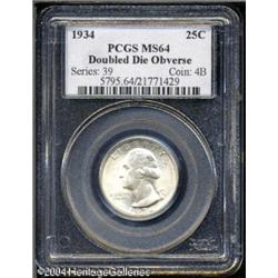 1934 25C Doubled Die Obverse MS64 PCGS. The date a <B>1934 25C Doubled Die Obverse MS64 PCGS.</B></I> The date and motto appear to be fuzzy due to the doubling. All other detail is sharp and crisp, with silvery and untoned surfaces. Scarce variety. Population: 19 in 64, 24 finer (11/04). <BR><BR><B>Important notice:</B> Heritage usually auctions material at the rate of 200-250 lots per hour. On some occasions eBay Live bid software or the Internet may not be able to keep up with the pace of the auction. We recommend placing a realistic absentee bid now as insurance to avoid disappointment. Occasionally the auctioneer may eliminate or reject an eBay Live bid, and the auctioneer may also reopen a lot after the close of the eBay live bidding (usually because we missed an audience bid), and may reject your bid even if it shows you as the winning bidder. By bidding via eBay Live, you agree that Heritage may award the lot to another bidder at its sole discretion under the circumstances described above or any other reasonable circumstances. Since eBay bids are not shown to us until we open the lot on the floor, we treat those bids just like floor bids. In most cases the floor responds before the eBay bid is presented to us, due to Internet lag time, so for consistency we have made it a policy that floor bids are always considered first over tie eBay live bids. Also please note that all Heritage lots purchased through eBay Live carry a 20% Buyer's Premium. Please make sure you read the Terms and Conditions before you bid. This lot is being auctioned in conjunction with a live floor auction by Heritage Galleries & Auctioneers. All final auction and invoice information will be supplied by Heritage Galleries & Auctioneers, and all other information should be considered preliminary. Lot:5989