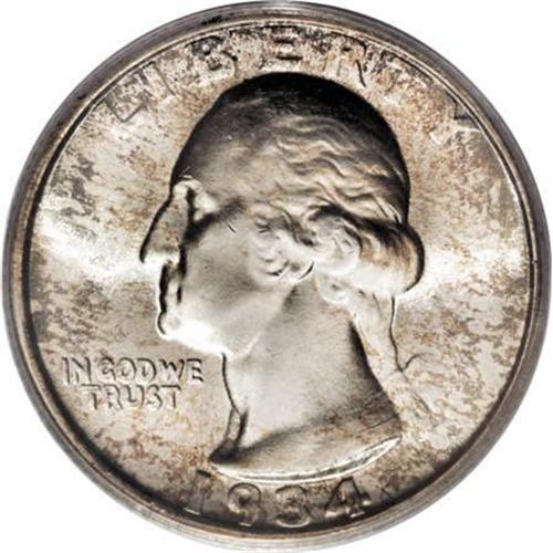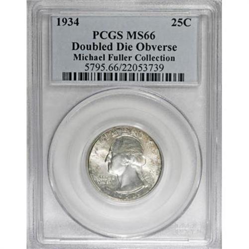 <B>1934 25C Doubled Die Obverse MS66 PCGS.</B></I> FS-009. Pronounced doubling is noted on IN GOD WE TRUST; separation is also visible on E of LIBERTY. Bright luster adorns this lovely Premium Gem. Nicely struck on the design features, with dapples of light blue and reddish-tan patina. A few minute marks on the obverse possibly preclude an even higher grade. PCGS has graded none finer (10/07).<BR><I>From The Michael Fuller Collection.</B></I><BR><BR><B>Coin Engraver:</B> John Flanagan<BR><BR><b>Shipping:</b> Coins & Currency (<a target="_blank" href="http://www.heritageauctions.com/common/shipping.php">view shipping information</a>)