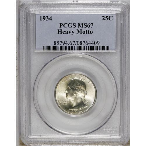 <B>1934 25C Heavy Motto MS67 PCGS.</B></I> One of three different Motto fonts in use for 1934. The Light Motto, continued from 1932, was replaced by both the Medium Motto and Heavy Motto. The Medium Motto was used on 1935-dated quarters, and the Large Motto emerged again on 1936 and later issues. This gorgeous and highly lustrous Superb Gem has light lime toning and beautifully smooth fields. Population: 4 in 67, 0 finer (10/06).<BR><BR><b>Shipping:</b> Coin/Currency (<a target="_blank" href="http://www.heritageauctions.com/common/shipping.php">view shipping information</a>)