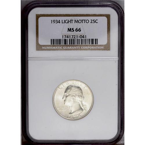 <B>1934<25C> Light Motto MS66 NGC.</B></I> The chestnut-tinged surfaces are lustrous and lovingly preserved. The Light Motto is considerably scarcer than the Medium Motto.<BR><I>From The Houston Collection of Washington Quarters.</B></I> <BR><BR><B>Important notice:</