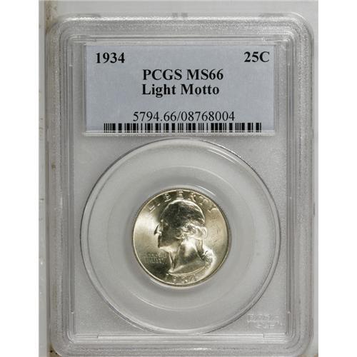 <B>1934 25C Light Motto MS66 PCGS.</B></I> Delicate champagne patina graces this highly lustrous Premium Gem. Only a few minuscule marks are noted on the sharply struck devices. Population: 60 in 66, 5 finer (9/06).<BR><BR><b>Shipping:</b> Coin/Currency (<a target="_blank" href="http://www.heritageauctions.com/common/shipping.php">view shipping information</a>)
