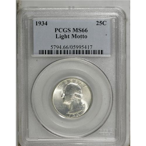 <B>1934 25C Light Motto MS66 PCGS.</B></I> Essentially untoned surfaces are awash in potent luster. Nicely struck, with no significant contact marks. Population: 61 in 66, 5 finer (10/06).<BR><BR><b>Shipping:</b> Coin/Currency (<a target="_blank" href="http://www.heritageauctions.com/common/shipping.php">view shipping information</a>)
