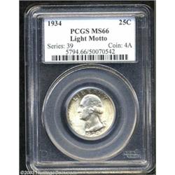 <table><tr><td><TABLE cellSpacing=0 cellPadding=0 width="100%" bgColor=#000000 border=0><TBODY> <TR><TD width="100%"><TABLE cellSpacing=1 cellPadding=3 width="100%" border=0><TBODY><TR><TD width="100%" bgColor=#79735c><FONT face=arial color=#ffffff size=3><B>Description</B> </FONT></TD></TR><TR><TD width="100%" bgColor=#ffffff><FONT face=arial size=2><B>1934 25C Light Motto MS66 PCGS.</B></I> Seldom seen in such a superior grade, this is the finest piece we have offered in some time. The surfaces are smooth and heavily frosted with irregular patches of russet patina scattered around the rims. The only defects of any note are a couple of tiny abrasions on the eagle's breast on the reverse. A scarce 1934 variant and a recognized Redbook variety. </FONT></TD></TR></TBODY></TABLE></TD></TR></TBODY></TABLE><BR><A name=PricesRealized></A><TABLE cellSpacing=0 cellPadding=0 width="100%" bgColor=#000000 border=0><TBODY><TR><TD width="100%"><TABLE cellSpacing=1 cellPadding=3 width="100%" border=0><TBODY><TR><TD width="100%" bgColor=#79735c><A name=PR><FONT face=arial color=#ffffff size=3><B>Previous Prices from Heritage Auctions</B> </FONT></A></TD></TR><TR><TD bgColor=#f6f6ed><TABLE cellSpacing=0 cellPadding=0 width="100%" border=1><TBODY><TR><TD align=middle width="33%"><B>Date</B></TD><TD align=middle width="33%"><B>Service</B></TD><TD align=middle width="33%"><B>Price</B></TD></TR><TR bgColor=whitesmoke><TD width="33%"><B>01/02/2001</B></TD><TD width="33%">NGC</TD><TD width="33%">$575.00</TD></TR><TR bgColor=whitesmoke><TD width="33%"><B>10/03/2000</B></TD><TD width="33%">PCGS</TD><TD width="33%">$650.00</TD></TR><TR bgColor=whitesmoke><TD width="33%"><B>07/11/2000</B></TD><TD width="33%">NGC</TD><TD width="33%">$320.00</TD></TR><TR bgColor=whitesmoke><TD width="33%"><B>08/08/2001</B></TD><TD width="33%">PCGS</TD><TD width="33%">$690.00</TD></TR><TR bgColor=whitesmoke><TD width="33%"><B>04/05/2001</B></TD><TD width="33%">NGC</TD><TD width="33%">$471.50</TD></TR><TR bgColor=whitesmoke><TD width="33%"><B>01/05/2001</B></TD><TD width="33%">PCGS</TD><TD width="33%">$920.00</TD></TR><TR bgColor=whitesmoke><TD width="33%"><B>10/04/2000</B></TD><TD width="33%">PCGS</TD><TD width="33%">$494.50</TD></TR><TR bgColor=whitesmoke><TD width="33%"><B>08/08/1998</B></TD><TD width="33%">PCGS</TD><TD width="33%">$440.00</TD></TR></TBODY></TABLE></TD></TR><TR><TD bgColor=#ffffff><FONT face=arial size=1 ?>PLEASE NOTE: All prices realized reflect the final hammer price PLUS the buyer's premium in auctions that charge a buyer's premium. Each item has a notation at the top of the listing indicating whether that lot included a buyer's premium. Example: A item that sells with a final hammer price of $100 and a 20% buyer's premium will display with a price realized of $120. All information listed is intended to be as accurate as possible, but errors are possible. Please use this guide carefully and inform us of any inaccuracies. </FONT></TD></TR></TBODY></TABLE></TD></TR></TBODY></TABLE><BR><TABLE cellSpacing=0 cellPadding=0 width="100%" bgColor=#000000 border=0><TBODY><TR><TD width="100%"><TABLE cellSpacing=1 cellPadding=3 width="100%" border=0><TBODY><TR><TD width="100%" bgColor=#79735c colSpan=6><FONT face=arial color=#ffffff size=3><B>Price Guide*</B> </FONT></TD></TR><TR bgColor=#f6f6ed><TD align=middle><B>Grade</B> </TD><TD align=middle><B>Coin World<BR>(Trends)</B> </TD><TD align=middle><B>Numismedia<BR>Retail</B> </TD><TD align=middle><B>Numismedia<BR>Wholesale</B> </TD><TD align=middle><B>Coin<BR>Universe</B> </TD><TD align=middle><B>Heritage<BR>Value Index</B> </TD></TR><TR bgColor=#ffffff><TD align=middle>65</TD><TD align=right>---</TD><TD align=right>$475.00</TD><TD align=right>$380.00</TD><TD align=right>$550.00</TD><TD align=right>$465.00</TD></TR><TR style="FONT-WEIGHT: bold" bgColor=#cccfdd><TD align=middle>66</TD><TD align=right>---</TD><TD align=right>$910.00</TD><TD align=right>$725.00</TD><TD align=right>$2,450.00</TD><TD align=right>$1,232.50</TD></TR><TR bgColor=#ffffff><TD align=middle>67</TD><TD align=right>---</TD><TD align=right>---</TD><TD align=right>---</TD><TD align=right>$9,000.00</TD><TD align=right>$5,150.00</TD></TR><TR bgColor=#ffffff><TD colSpan=6><FONT size=1>*All information listed is intended to be as accurate as possible, but errors are possible. No item may be returned or refused based on this information which is provided as a service to our customers. You should contact each pricing source directly to determine the accuracy of this information. </FONT></TD></TR></TBODY></TABLE></TD></TR></TBODY></TABLE><BR><TABLE cellSpacing=0 cellPadding=0 width="100%" bgColor=#000000 border=0><TBODY><TR><TD width="100%"><TABLE cellSpacing=1 cellPadding=3 width="100%" border=0><TBODY><TR><TD width="100%" bgColor=#79735c><FONT face=arial color=#ffffff size=3><B>Population Guide</B> </FONT></TD></TR><TR bgColor=#ffffff><TD align=middle><!-- Begin Output of Population Grid--><TABLE cellSpacing=0 cellPadding=0 width="100%" border=0><TBODY><TR><TD vAlign=center><TABLE cellSpacing=0 width="100%" border=1 cellsadding="3"><TBODY><TR><TD vAlign=center><TABLE cellSpacing=0 cellPadding=3 width="100%" border=1><TBODY><TR><TD vAlign=center align=middle bgColor=#f0f1e8 colSpan=2 <CENTER><FONT face=Arial size=2><B>PCGS Pop </B></FONT><CENTER></CENTER></TD><TD vAlign=center align=middle bgColor=#f0f1e8 colSpan=2><CENTER><FONT face=Arial size=2><B>NGC Pop</B></CENTER></FONT></TD></TR><TR><TD vAlign=center><FONT face=Arial size=2>(66)</FONT> </TD><TD vAlign=center align=right><FONT face=Arial size=2>31</FONT> </TD><TD vAlign=center><FONT face=Arial size=2>(66)</FONT> </TD><TD vAlign=center align=right><FONT face=Arial size=2>17</FONT> </TD></TR><TR><TD vAlign=center><FONT face=Arial size=2>(>66)</FONT> </TD><TD vAlign=center align=right><FONT face=Arial size=2>4</FONT> </TD><TD vAlign=center><FONT face=Arial size=2>(>66)</FONT> </TD><TD vAlign=center align=right><FONT face=Arial size=2>1</FONT> </TD></TR></TBO