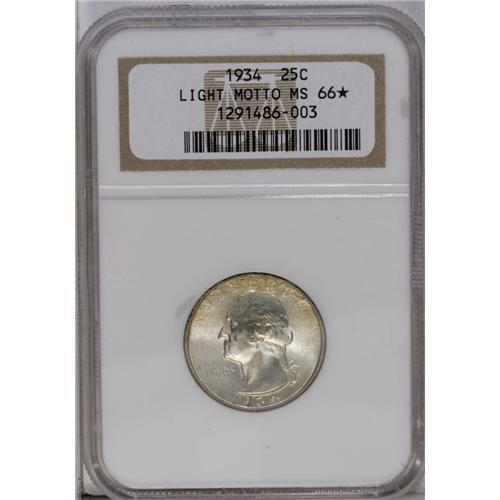 <B>1934<25C> Light Motto MS66 <img border='0' src='http://www.heritagecoins.com/images/star.gif' width=10 height=10> NGC.</B></I> Nicely struck with great luster and traces of gold patina. NGC has certified only two coins of this variety in 66 with the Star Designation and only one coin in non-starred 67 (7/06).