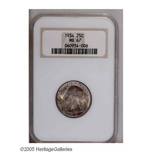1934 25C MS67 NGC. Medium Motto. Freckles of sea-green 1934[25C] MS67 NGC.