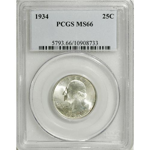 <B>1934 25C Medium Motto MS66 PCGS.</B></I> PCGS Population (260/66). NGC Census: (239/50). Mintage: 31,912,052. Numismedia Wsl. Price: $180. (#5793)<BR><BR><b>Shipping:</b> Coins & Currency (<a target="_blank" href="http://www.heritageauctions.com/common/shipping.php">view shipping information</a>)