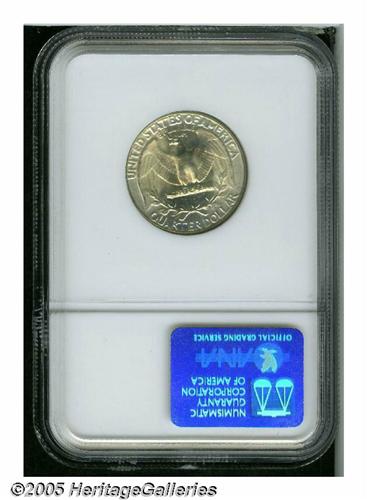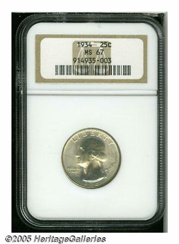 <B>1934<25C> Medium Motto MS67 NGC.</B></I> A light film of silver-gray toning over smooth satiny surfaces, nicely struck, and surfaces seemingly free of major contact marks. A few miniscule ticks on the eagle and Washington's cheek are mentioned for accuracy, but do not distract.