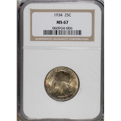 <B>1934 25C Medium Motto MS67 NGC.</B></I> NGC Census: (52/0). PCGS Population (65/1). Mintage: 31,912,052. Numismedia Wsl. Price for NGC/PCGS coin in MS67: $700. (#5793)<BR><BR><b>Shipping:</b> Coins & Currency (<a target="_blank" href="http://www.heritageauctions.com/common/shipping.php">view shipping information</a>)