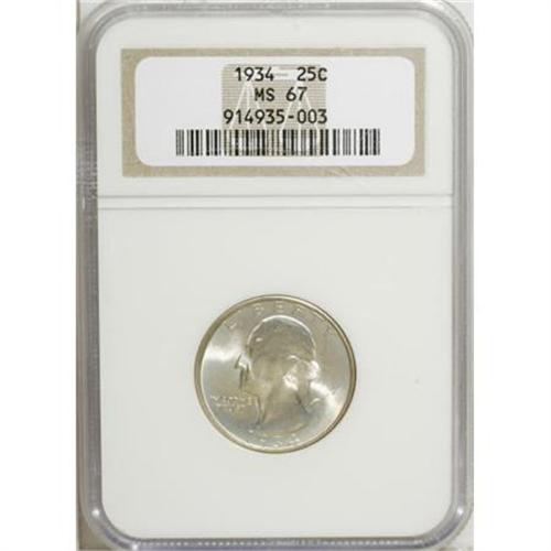 <B>1934 25C Medium Motto MS67 NGC.</B></I> Census: 51 in 67, 0 finer (3/07).<BR><BR><B>Coin Engraver:</B> John Flanagan<BR><BR><b>Shipping:</b> Coins & Currency (<a target="_blank" href="http://www.heritageauctions.com/common/shipping.php">view shipping information</a>\)