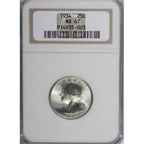 <B>1934 25C Medium Motto MS67 NGC.</B></I> Census: 51 in 67, 0 finer (3/07).<BR><BR><B>Coin Engraver:</B> John Flanagan<BR><BR><b>Shipping:</b> Coins & Currency (<a target="_blank" href="http://www.heritageauctions.com/common/shipping.php">view shipping information</a>)