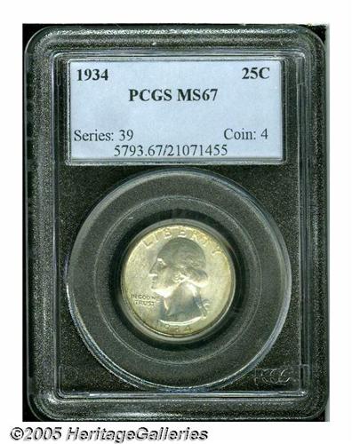 <B>1934<25C> Medium Motto MS67 PCGS.</B></I> Cartwheel luster readily penetrates the original pearl-gray and reddish-golden patina. A nicely struck and well preserved Superb Gem. Population: 52 in 67, 1 finer (5/05).<BR><I>From The Western Hills Collection.</B></I>