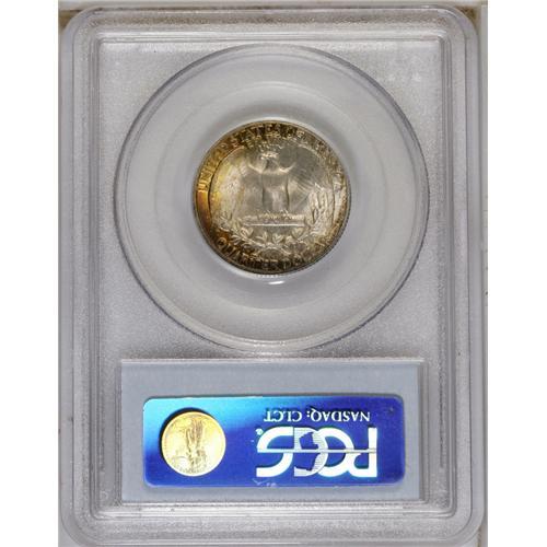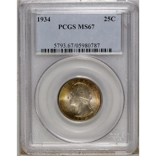 <B>1934 25C Medium Motto MS67 PCGS.</B></I> Reddish-brown, gold, and violet patina covers much of the periphery, while the remainder is pearl-gray. A highly lustrous and pleasing Superb Gem. Population: 61 in 67, 1 finer (12/06).<BR><BR><b>Shipping:</b> Coins & Currency (<a target="_blank" href="http://www.heritageauctions.com/common/shipping.php">view shipping information</a>)