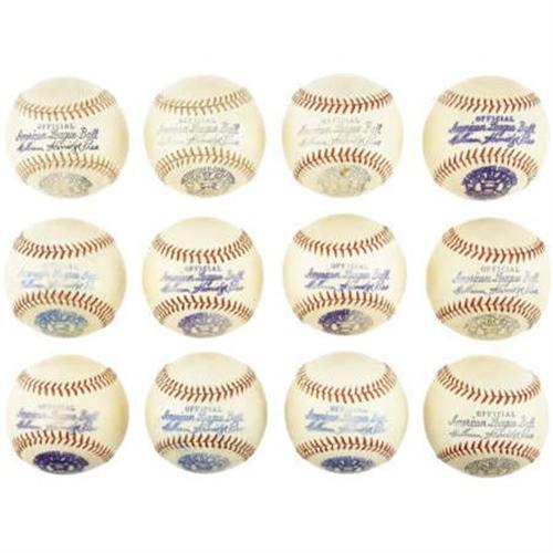 <B>1934-39 Official American League (Harridge) Baseballs in Boxes (12).</B></I> A dozen baseballs ready for action on the diamond with Gehrig, DiMaggio and Foxx. Though all of the boxes have been opened, we can assure you that the baseballs inside are as virginal as can be, perhaps a bit toned by seven decades in seclusion but bearing fierce navy stamping and not a speck of use or wear. All but a couple of the boxes are in comparably superb condition. They definitely don't make them like this anymore, and the available supply of untouched Harridges dwindles with every passing year. Blink and they'll be gone forever.<BR><BR><b>Shipping:</b> Balls, Pucks, etc., Small (<a target="_blank" href="http://www.heritageauctions.com/common/shipping.php">view shipping information</a>)