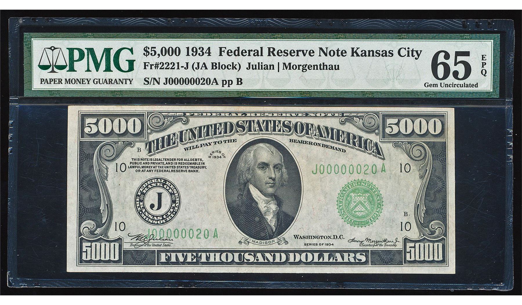 One 1934 $5,000 Federal Reserve Note Kansas City Fr.2221-J PMG Gem Uncirculated 65EPQ. This 1934 $5,000 Federal Reserve Note from the Kansas City district is one of the most incredible small size notes known. This note has been graded PMG Gem Uncirculated 65EPQ and is tied for finest known for the type amongst all districts. The note has excellent margins, color and embossing seen throughout! This note would certainly be the flagship note in any collection as $5,000 notes are a scarcer than the coveted $10,000 notes, mostly because of the 100 that survived when the Binion hoard was dispersed. PMG Certified.