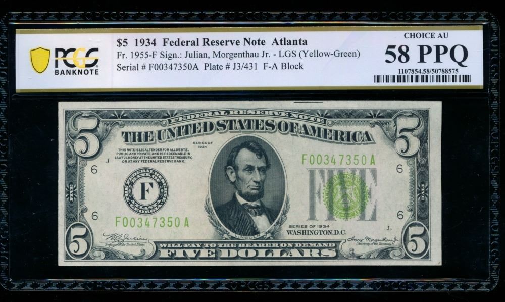 One 1934 $5 Atlanta FRN PCGS 58PPQ.