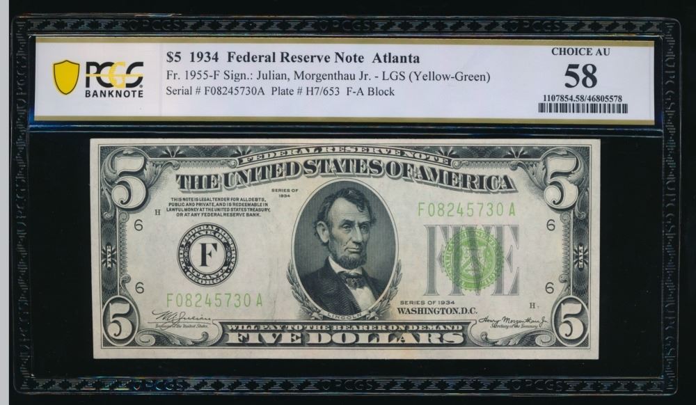 One 1934 $5 Atlanta FRN PCGS 58.