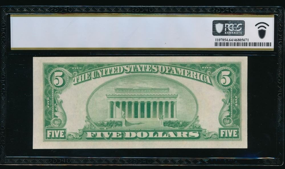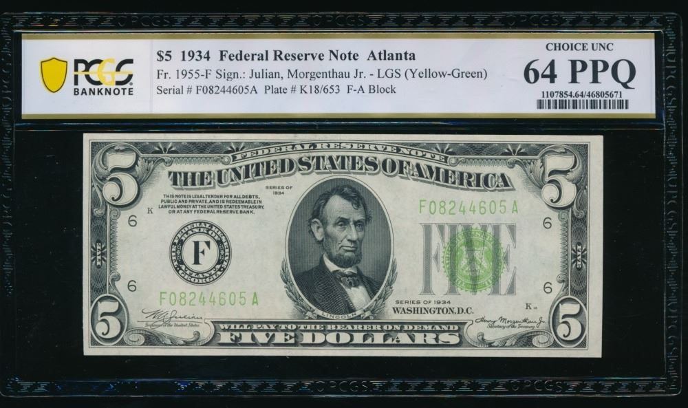One 1934 $5 Atlanta FRN PCGS 64PPQ.