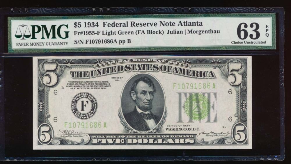 One 1934 $5 Atlanta Federal Reserve Note PMG 63EPQ.