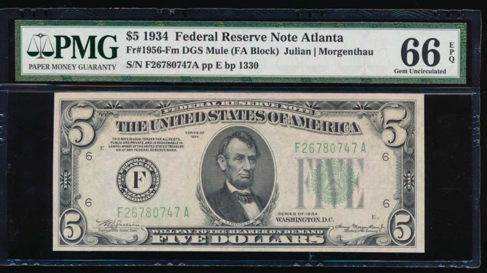 One 1934 $5 Atlanta Federal Reserve Note PMG 66EPQ.