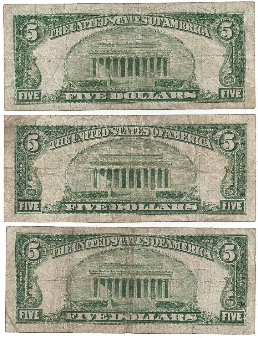 1934 $5 Bill Currency Lot of 3.