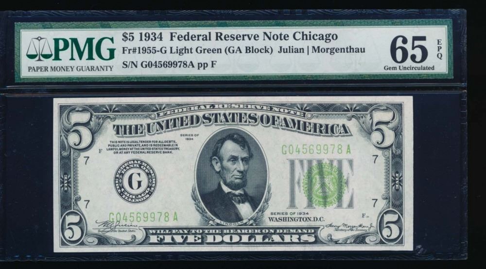 One 1934 $5 Chicago Federal Reserve Note PMG 65EPQ.
