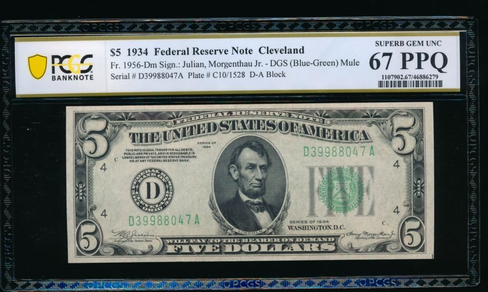 One 1934 $5 Cleveland FRN PCGS 67PPQ.