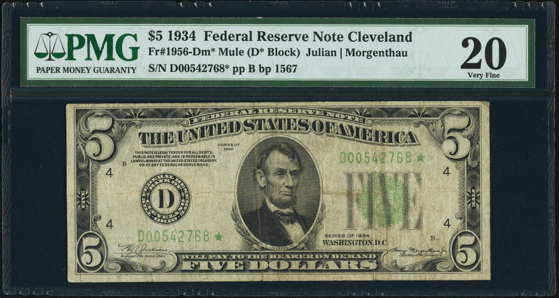One 1934 $5 Cleveland Federal Reserve STAR Note PMG 20.