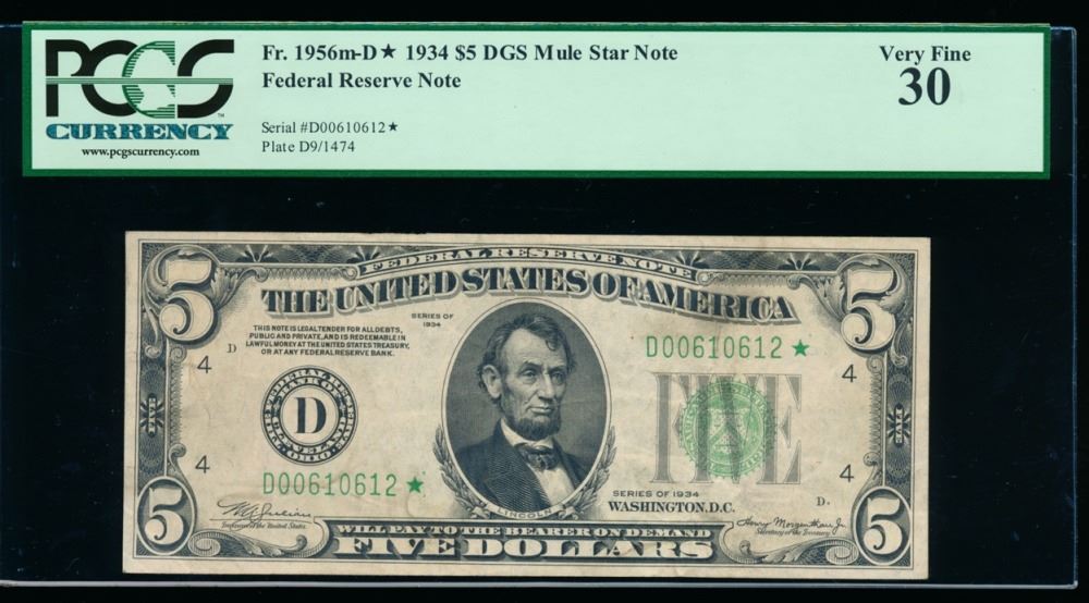 One 1934 $5 Cleveland Federal Reserve Star Note PCGS 30.