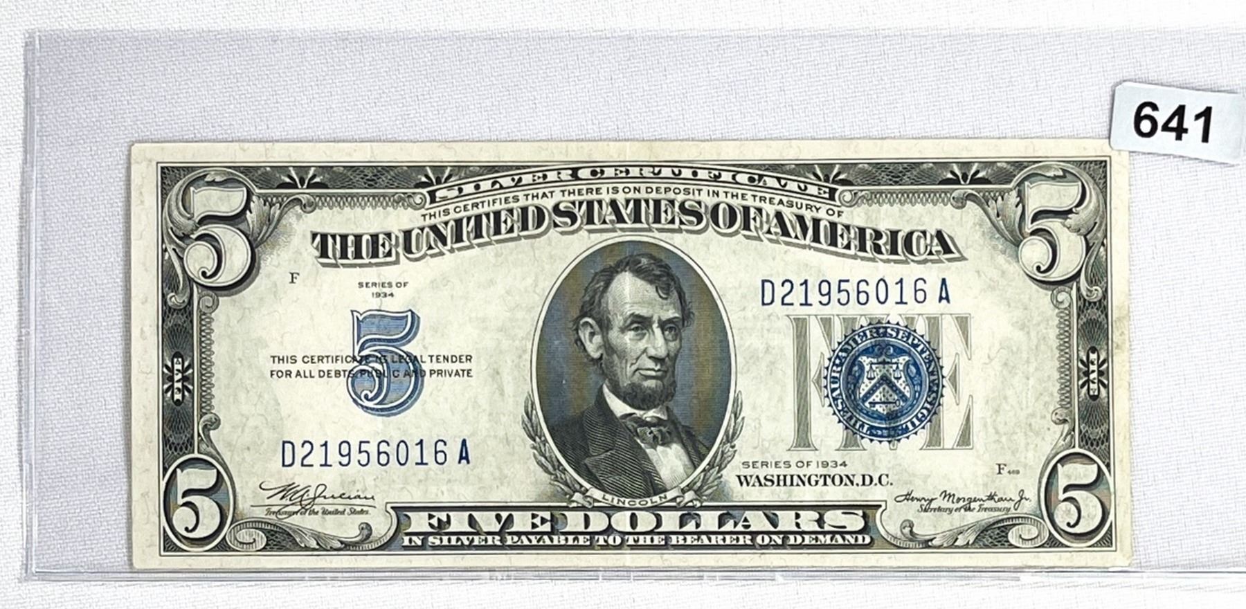 1934 $5 Dollar Silver Certificate CLOSELY UNC