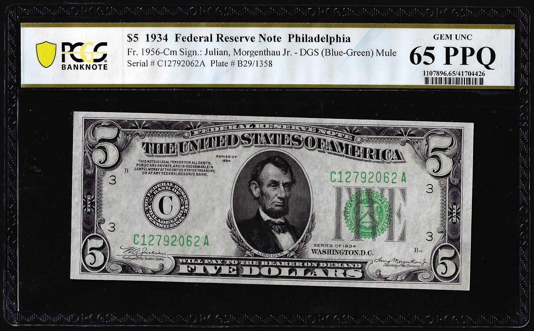 One 1934 $5 Federal Reserve Note Philadelphia Fr.1956-Cm PCGS Gem Uncirculated 65PPQ. PCGS Graded.