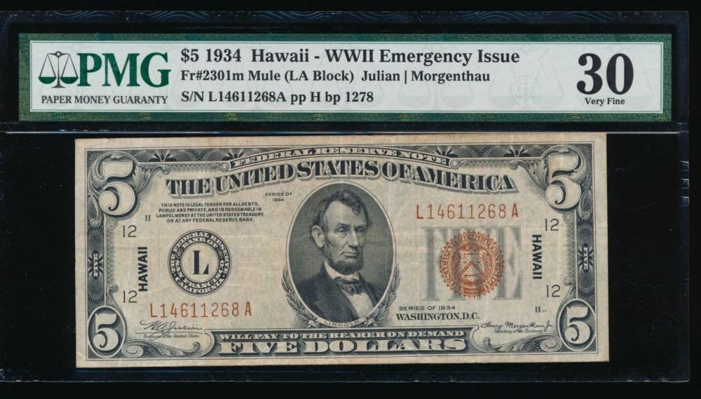 One 1934 $5 Hawaii Federal Reserve Note PMG 30.
