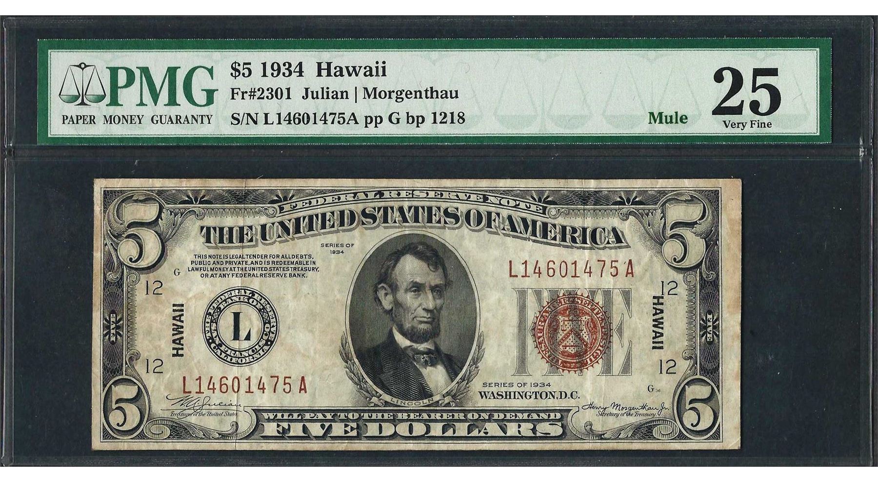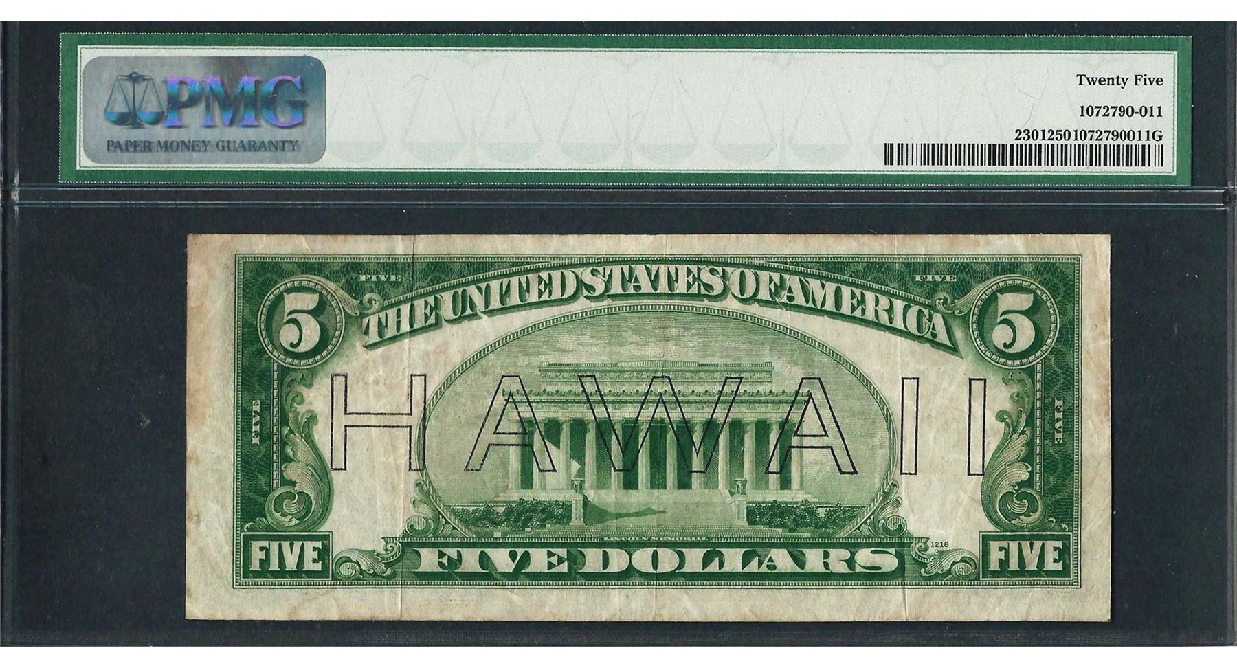 1934 $5 Hawaii Federal Reserve WWII Emergency Note Fr.2301 Mule PMG Very Fine 25