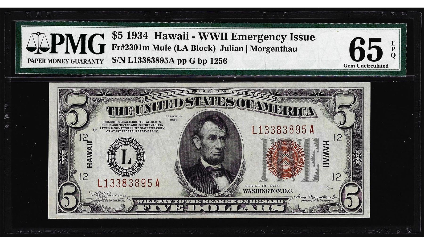 One 1934 $5 Hawaii WWII Emergency Issue Federal Reserve Note PMG Gem Uncirculated 65EPQ. PMG Certified.